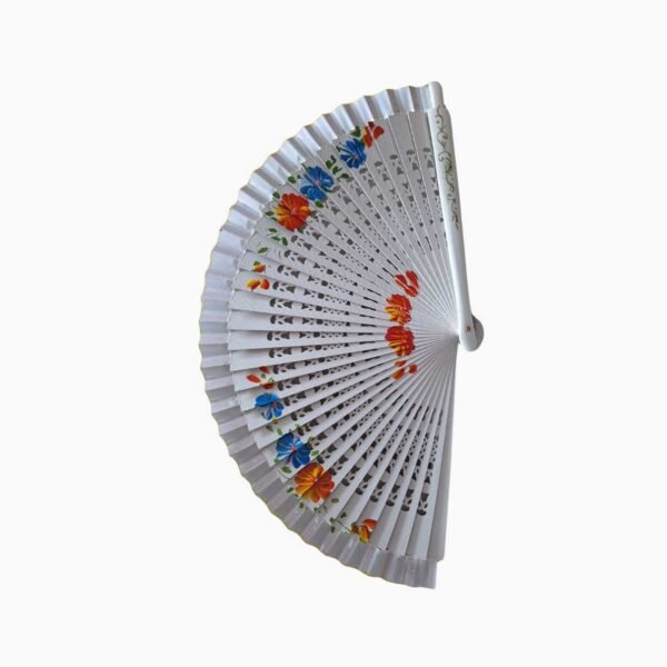 Elegancia y frescura en un diseño artesanal. Este abanico en tono blanco con flores pintadas a mano es una pieza sofisticada que combina tradición y estilo. Su estructura ligera y resistente lo hace ideal para el baile flamenco, la danza o como un accesorio distintivo para cualquier ocasión. Importado desde España, su acabado impecable y sus detalles florales aportan un toque de distinción y belleza atemporal.