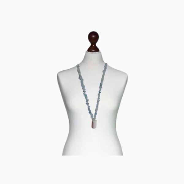 Un collar de estilo rústico con cuentas en tonos azules y un colgante ovalado que aporta un toque natural y orgánico. Ideal para looks bohemios y desenfadados.